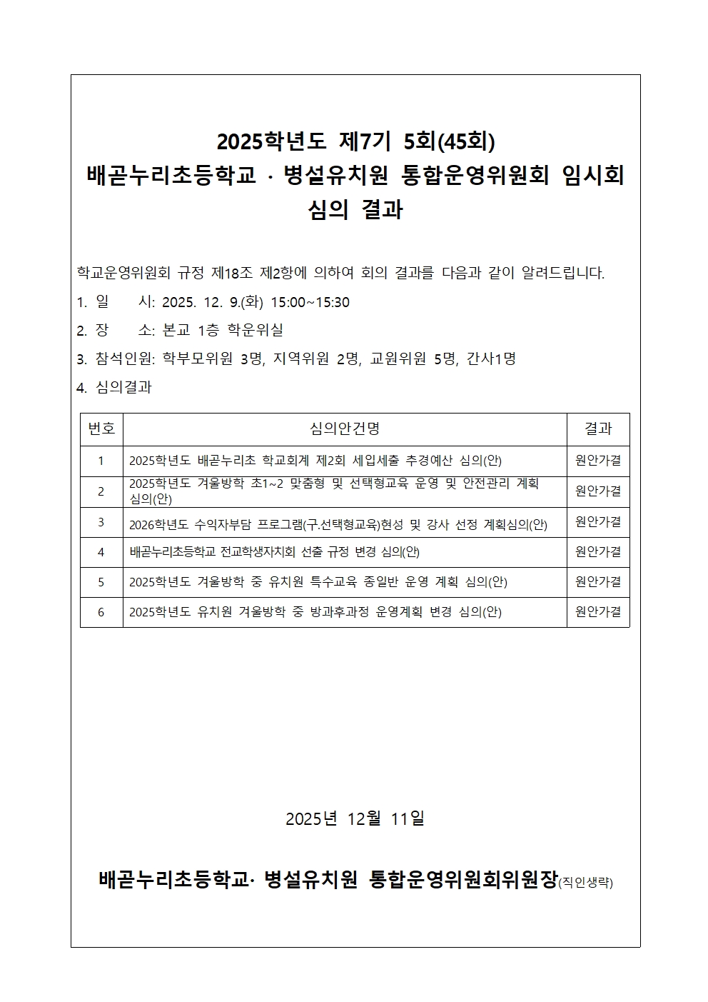 - 2025Çг⵵ Á¦7±â ¹è°ð´©¸®ÃʵîÇб³ .º´¼³À¯Ä¡¿ø ÅëÇտÀ§¿øÈ¸ 5ȸ ÀÓ½Ãȸ Çкθð ºÎ´ã°æºñ ½ÉÀÇ ¾È°ÇÀ» ÷ºÎÇÏ¿À´Ï