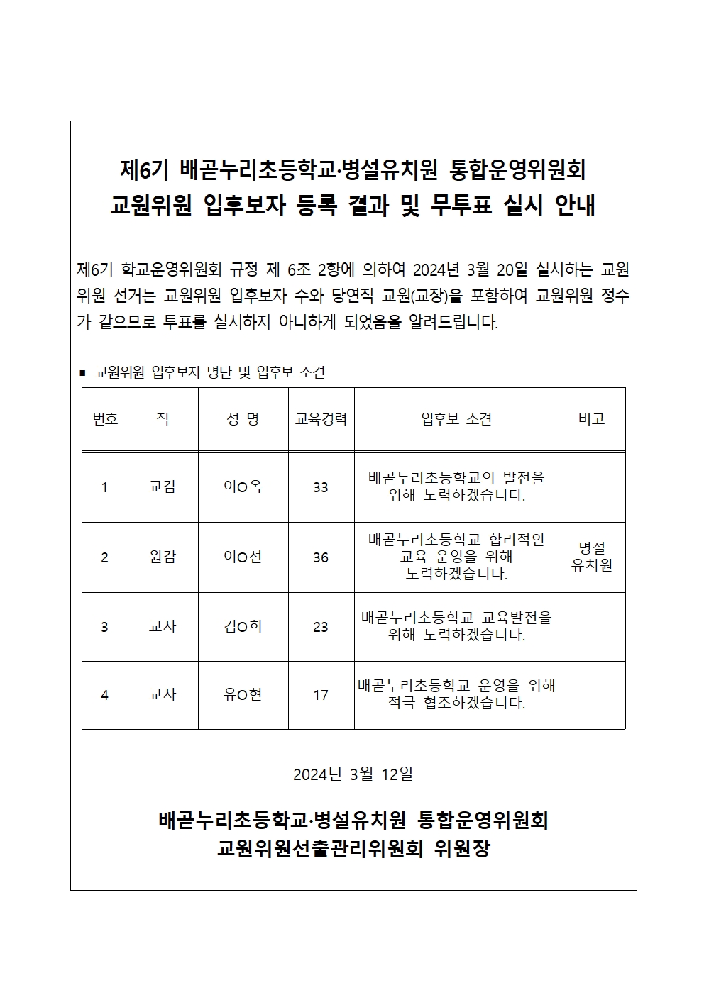 [ÀϹÝ] 2024Çг⵵ Á¦6±â ¹è°ð´©¸®ÃʵîÇб³¡¤º´¼³À¯Ä¡¿ø ÅëÇտÀ§¿øÈ¸ ±³¿øÀ§¿ø ÀÔÈĺ¸ÀÚ °øº¸