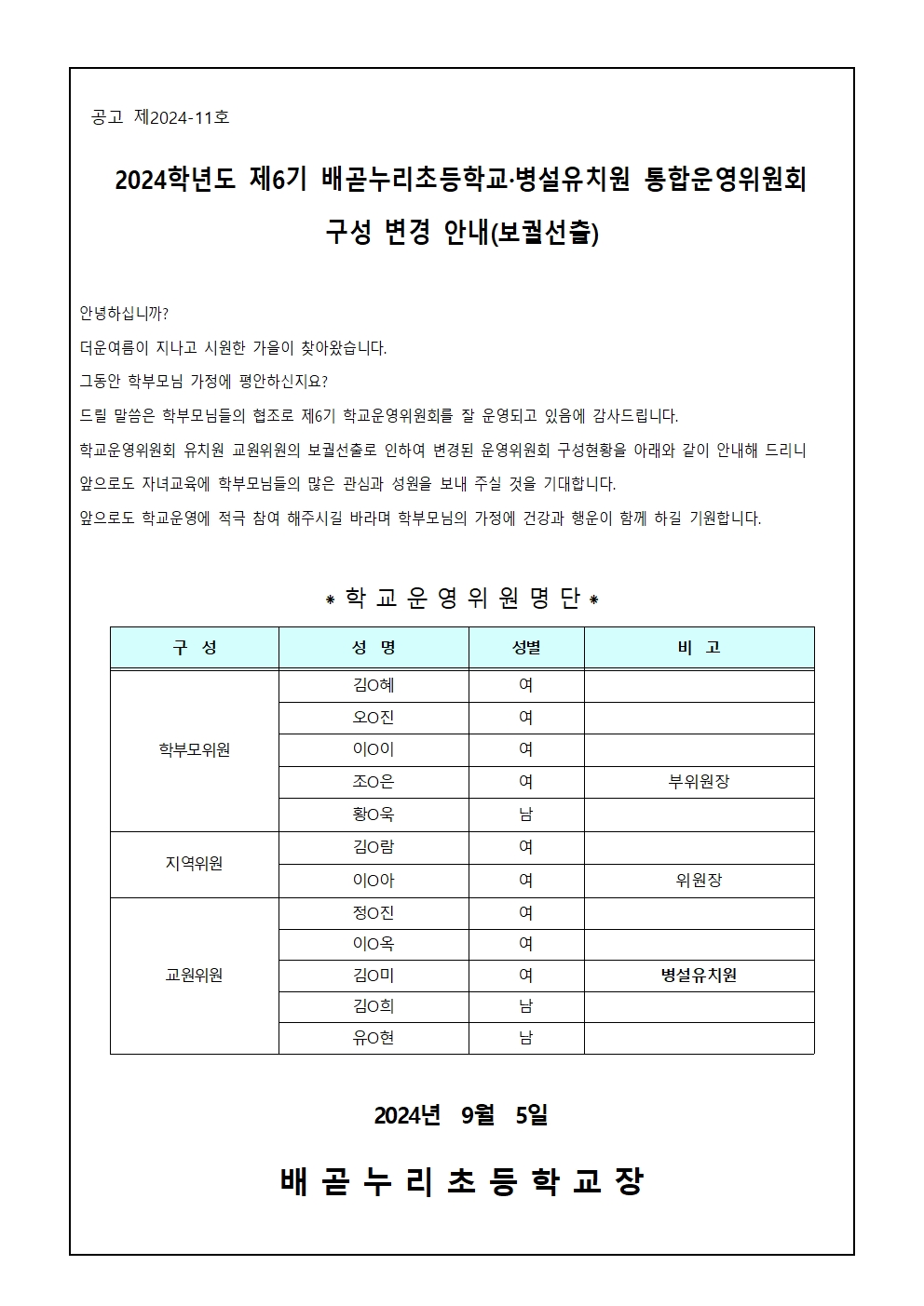 [ÀϹÝ] 2024Çг⵵ Á¦6±â ¹è°ð´©¸®ÃʵîÇб³¡¤º´¼³À¯Ä¡¿ø ÅëÇտÀ§¿øÈ¸ ±¸¼º°á°ú º¯°æ(º¸±È)
